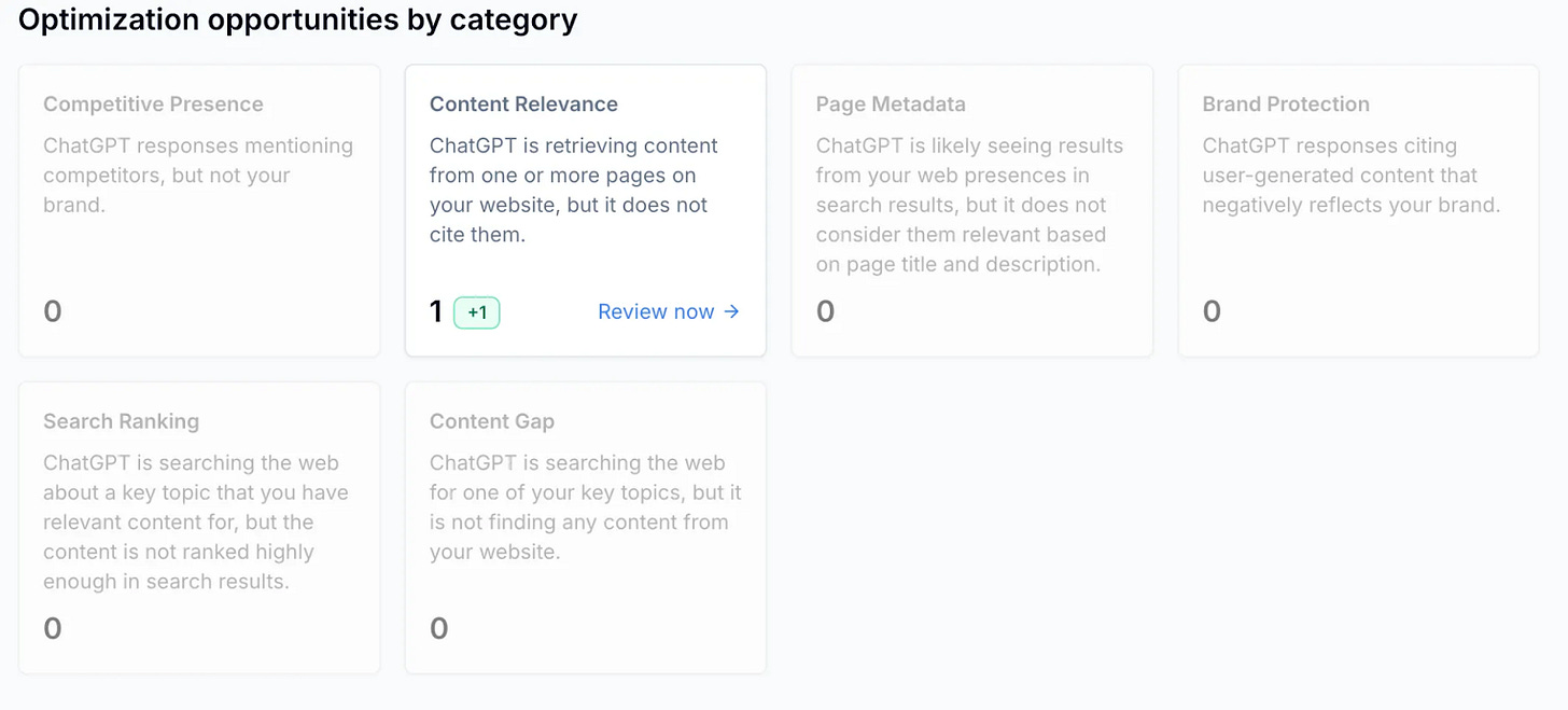 Insights into why you’re not getting cited – Scrunch surfaces optimization suggestions based on why AI engines are skipping your content or citing competitors instead. It’s not an exceptional analysis, but it packages the “why” for you, which helps if you’re managing multiple clients or brands.