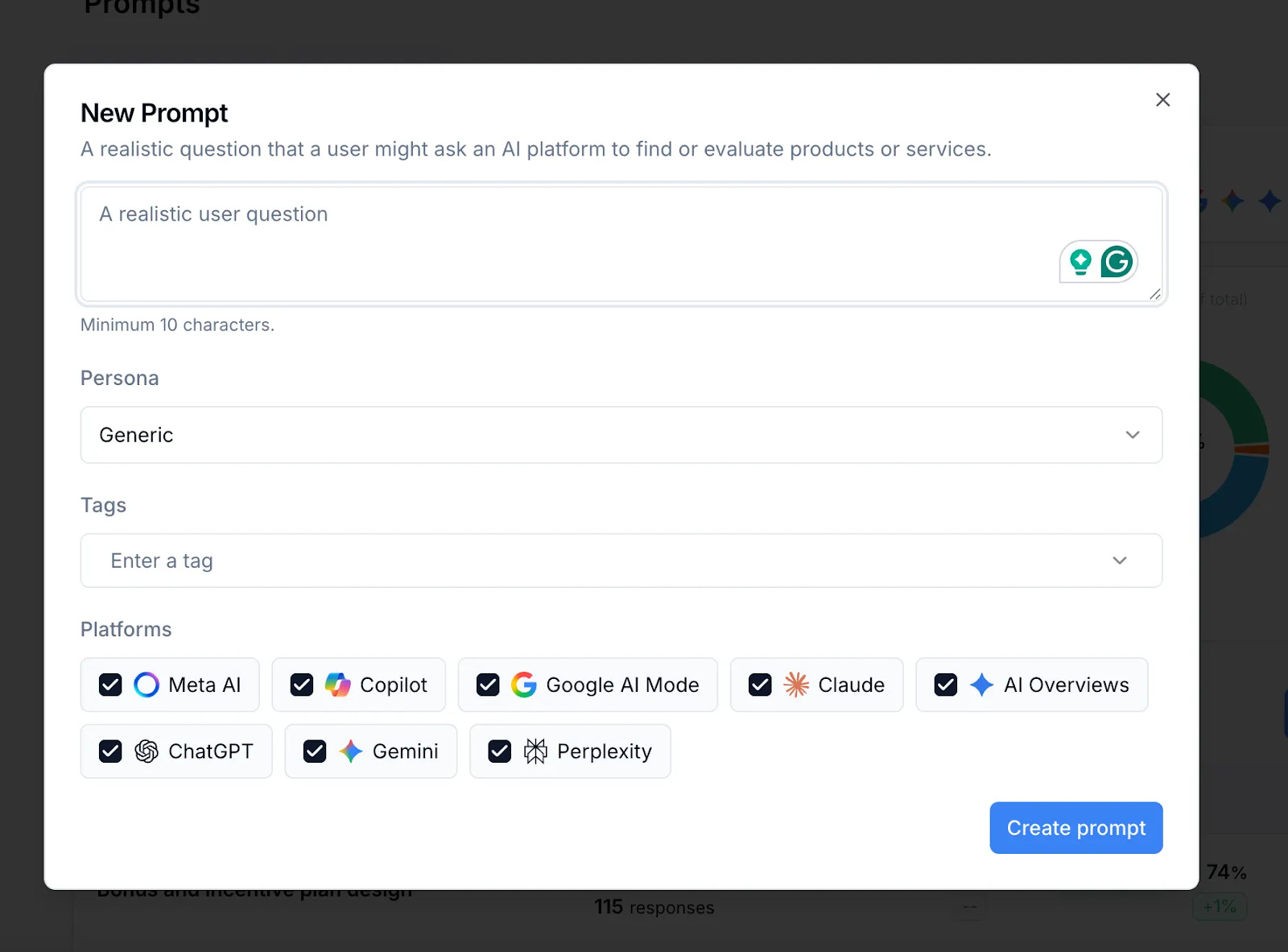 Sort of. The problem is that you have to add prompts manually. If you let Scrunch auto-generate them, it creates very specific, branded prompts like “best [your product category] like [your brand]”—where obviously your brand will show up.