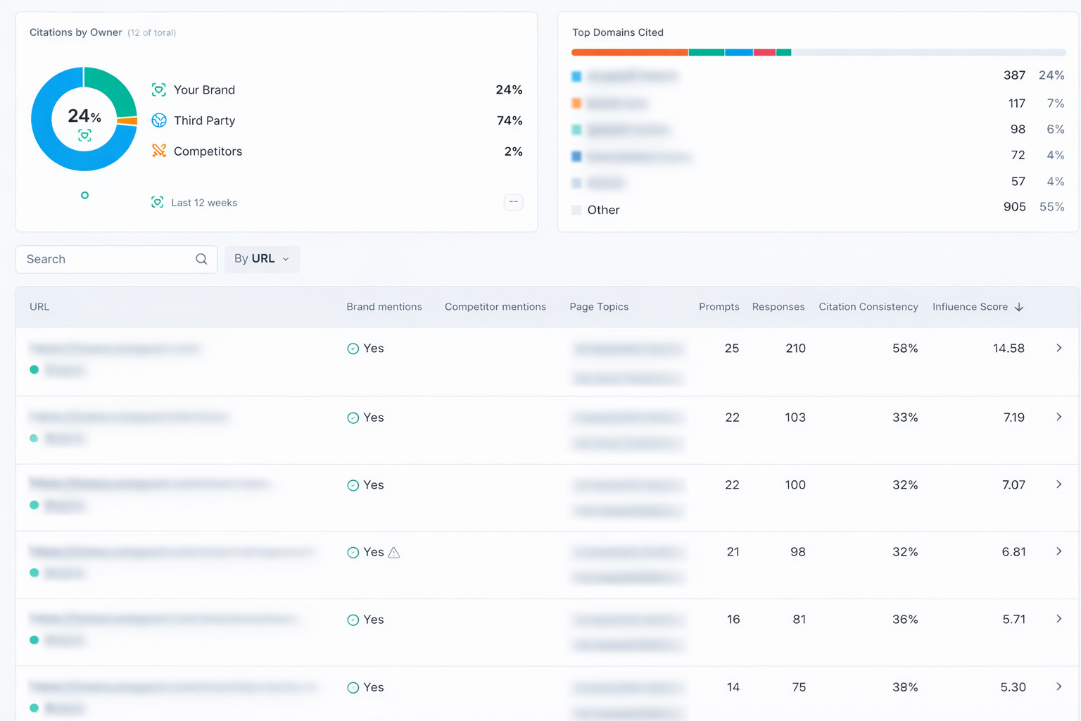 For each prompt you track, Scrunch shows you which other domains get cited, your citation share percentage, competitors’ shares, and third-party platform mentions (G2, Capterra, Gartner).